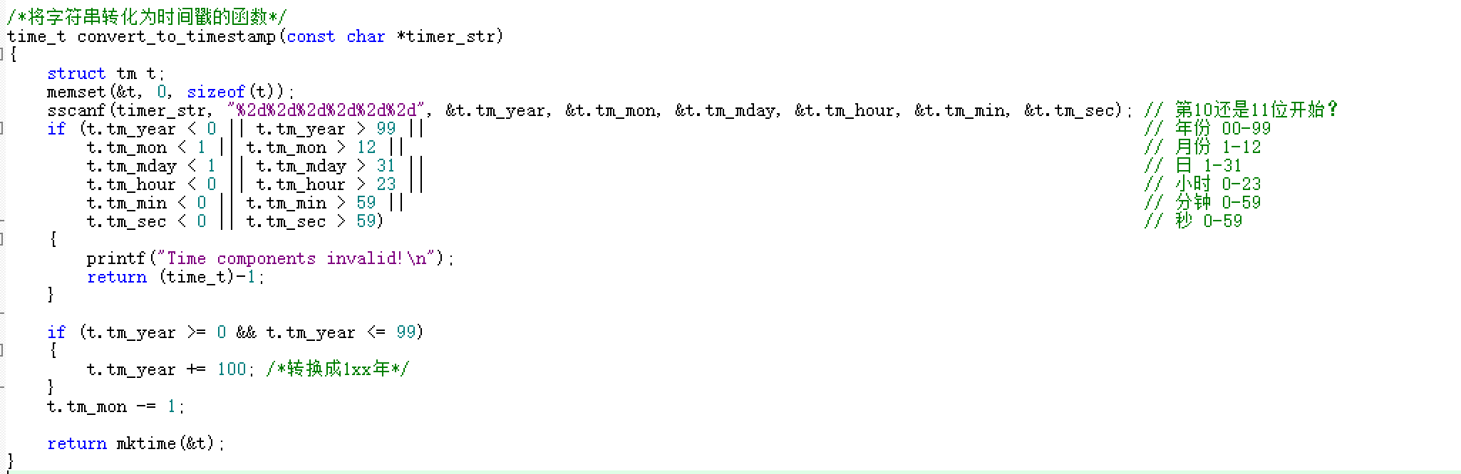 a.将字符串转时间戳 mktime函数 ;如何创建一个tm结构体,如何正确使用tm_year(拿到xx年(两位数年份)后,加上100,转换成1xx年,才能传入tm结构体),而且tm_mon是从0开始的,要减1