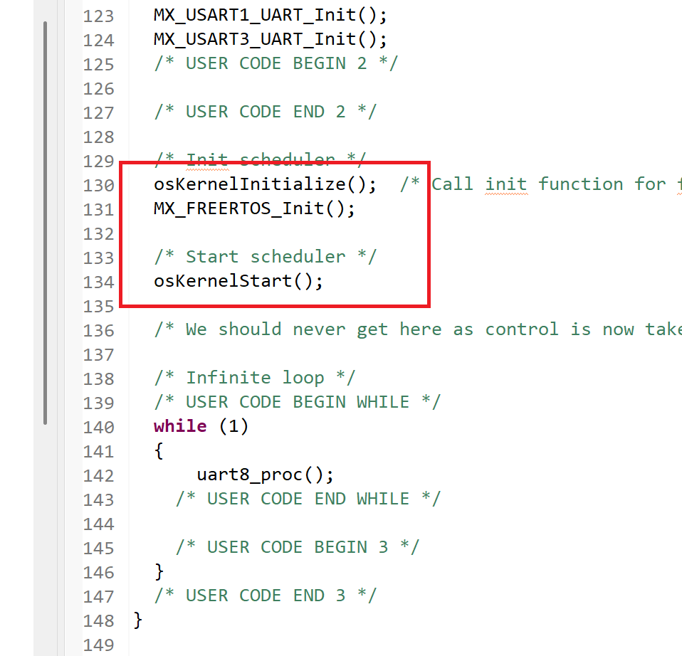 2、以STM32HAL库举例,在cubemx初始化FreeRTOS之后,会自动在主函数生成如下的初始化代码,程序在osKernelStart完成之后自己启动,RTOS开始调度,while(1)不会执行