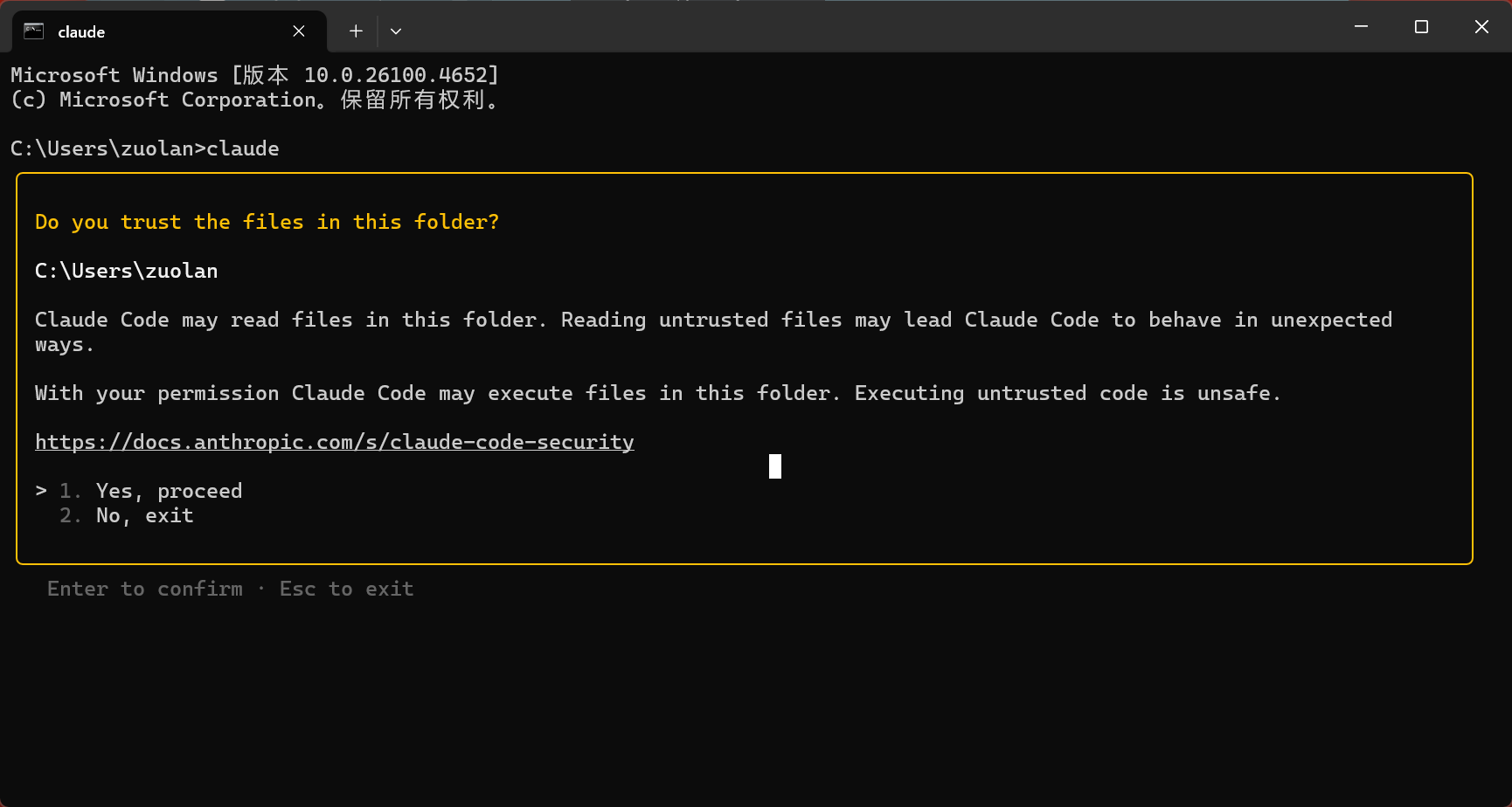 然后我们可以输入一下claude来验证一下他是不是真的安装好了,下面的意思是