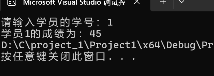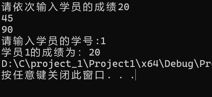 printf("该学员%d的成绩为:%d", j, student[j - 1]);