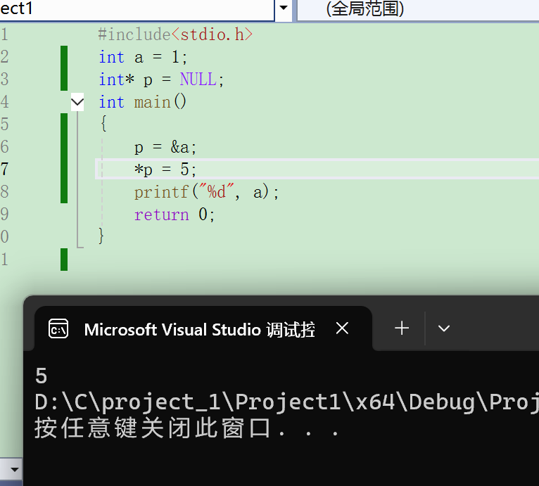 先有int a 和空指针b;然后p被赋值为a的地址;然后*p是a储存的数值,则a被赋值为5,接着打印a