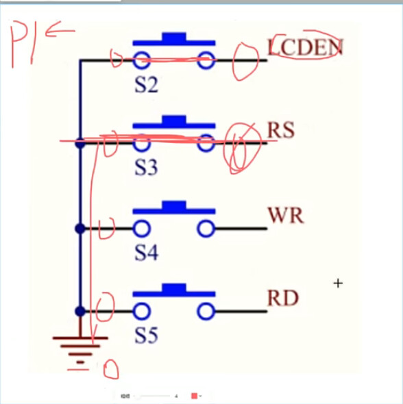 引脚接的是IO口P34到P37,检测按键是否按下,就是在检测对应的IO口是否为0