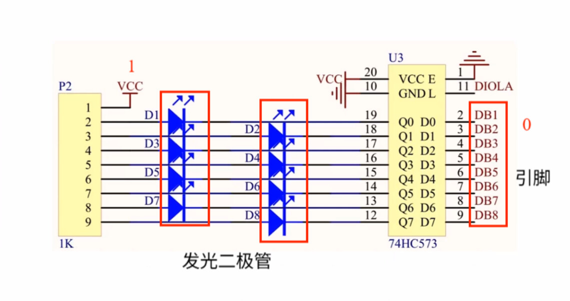 // 注意:其他引脚默认是高电平(1),对应的LED是熄灭状态