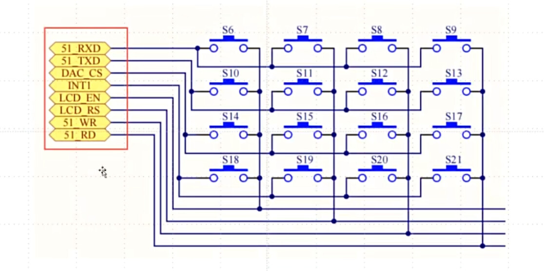 用4个行线 + 4个列线,组成16个按键的键盘。