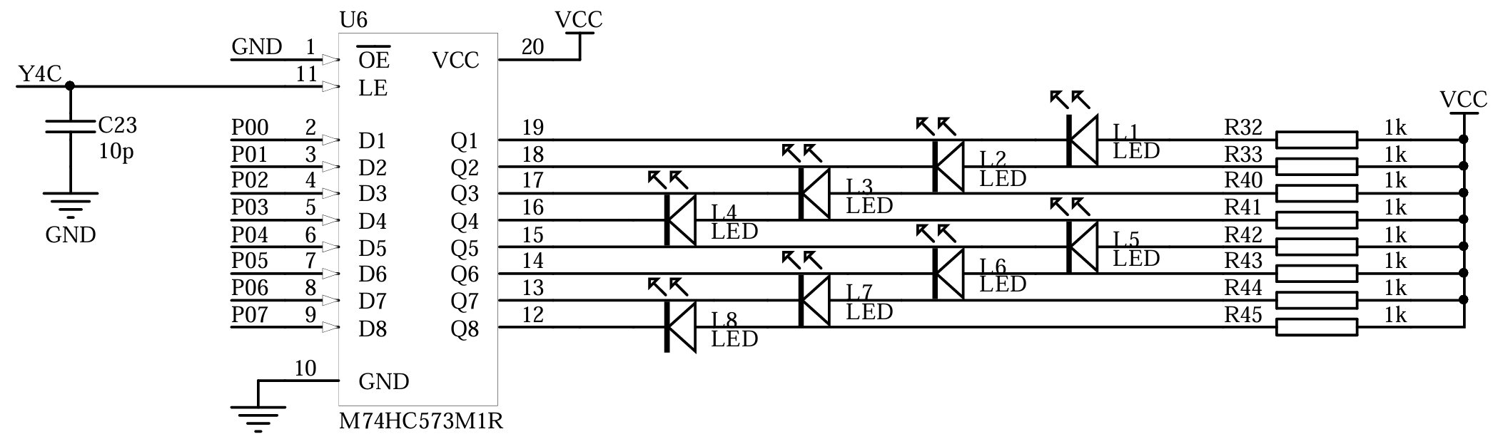 74HC573是一个8位锁存器的芯片(Chip)或集成电路(Integrated Circuit,IC),有源器件,可以一次性锁存8 bit数据。它包含 D0 ~ D7 ,以及 LE(Latch Enable,锁存使能)和 \overline{OE}(Output Enable,输出使能)共计10个输入端,其中 LE 和 \overline{OE} 是2个控制脚,还有 Q0 ~ Q7 共8个输出端。LE 高电平有效,\overline{OE} 低电平有效,因此符号上一般带一横。CT107D开发板上,74HC573的 \overline{OE} 引脚在使用时通常与 GND 连接在一起,也就是说,输出端一直有效。
