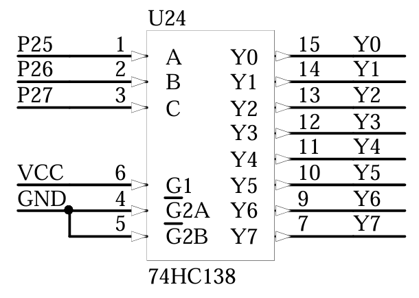 74HC138是一个3-8译码器的芯片或集成电路,有源器件,实现片选(选择芯片/外设),以3个IO口控制8个设备,避免总线冲突,节省单片机IO口。它包含 A 、B 、C 共3个地址输入端和 G1 、\overline{G2A} 、\overline{G2B} 共3个使能输入端,和 Y0 ~ Y7 共8个输出端,输出低电平有效。