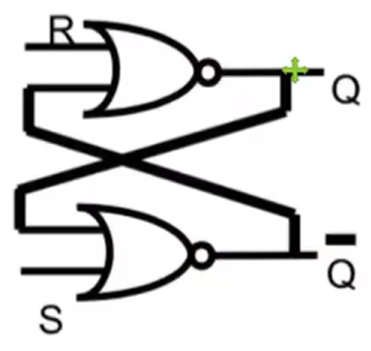 RS锁存器有 R(Reset,复位)和 S(Set,置位)两个输入端,有 Q 和 \bar{Q} 两个输出端。当写 S =1时,Q 变为1;当写 R =1时,Q 变为0。之后写 S =0、R =0,此时 Q 就被锁存,\bar{Q} = \neg Q 。注意,写 S =1、R =1是非法的。