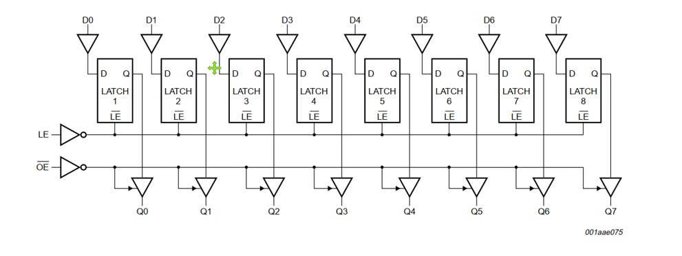当使能(LE)为高时,将上面数据(D)更新给数码管上侧(Q),使能为低时,输出将锁存在已建立的数据电平上,即不更新