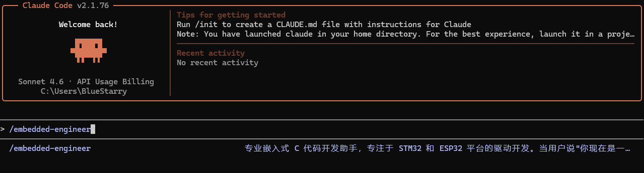 在以下路径新建一个skills文件夹:”C:\Users\用户名.claude”,然后在skills文件夹下新建一个embedded-engineer文件夹,进入embedded-engineer文件夹后新建一个SKILL.md文件。